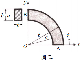 【已刪除】三、一具有均勻厚度 h,導電率為 σ 之導電材料,其形狀如圖三所示,為一大小四分之 一之扁平圓形墊圈(a quarter of a flat circular washer),內半徑為 a,外半徑為 b。 試求兩個尾端表面 A、B 間之電阻 R。(15 分)