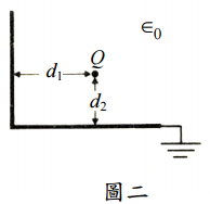 【已刪除】二、兩個接地且互相垂直的導體半平面(half-plane)如圖二所示。一點電荷Q距離兩半 平面各為d