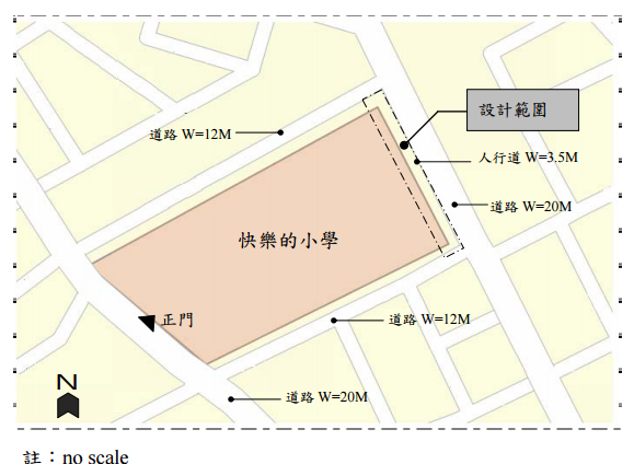 【已刪除】三、一所北部地區的開放性小學擬進行圍牆及人行道空間改善,請依據下列資料進行一 段的圍牆及人行道空間設計。 ⑴本小學位於北部某都市,校園環境如附圖,校園基地地勢平坦。校園外面圍繞著 3.5 公尺寬的人行道。 ⑵基地周邊環境皆為住宅區。 ⑶設計需求 設計範圍:小學校園東北側寬 3.5 公尺,長度約 100 公尺的人行道。(開放式 圍牆範圍最多往校內做 1 公尺寬) 設計內容:圍牆及人行道。 比例尺:各圖面比例尺由設計者自行訂定,但要能夠清楚表達圖面之各項內容。 圖面內容: