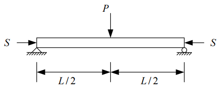 【已刪除】三、如圖所示之簡支梁,梁長 L,梁之撓曲剛度為 EI,已知梁跨度中央承受一集中力 P 作用,而沿梁軸線方向則承受水平壓力 S 作用,在此二外力作用下,梁跨度中央之 變位設為δ ,此δ 可表示成