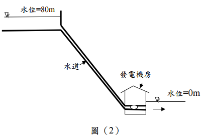 【已刪除】二、如圖(2)為某水力發電系統的示意圖。上層蓄水位為 80 m,下層蓄水位為 0 m, 若發電機出水量為 15 m