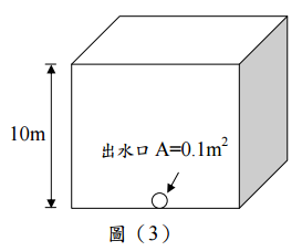 【已刪除】三、如圖(3)為內徑長度 10 m 的方形體蓄水池,其側邊底有個面積為 0.1 m