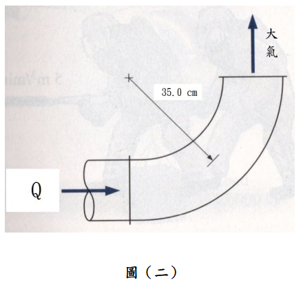 【已刪除】五、如圖(二)所示,90°彎管將水射向大氣,大氣之壓應力為零,管徑 10.0 cm,流量 Q = 0.0250 m