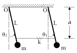 【已刪除】一、如圖所示兩個相同的單擺以彈簧在 a 處連結,單擺長度為 L,質量 m,彈簧常數 k, 試求此系統頻率為何?請描述各頻率所對應的振幅擺動狀態為何?(25 分)