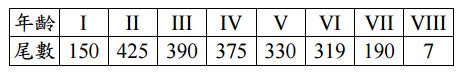 【已刪除】四、下表所示為透過採樣所得年齡別漁獲尾數,試問如何依據表中所提供數據繪製漁 獲曲線(Catch curve),並說明如何依據漁獲曲線計算全死亡係數 Z(非計算題)。 (20 分)