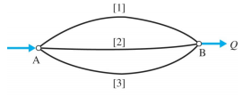 【已刪除】三、如下圖為一並聯管網系統,水流由 A 流至 B,各管之長度 L、管徑 D 及摩擦因子 f 分別為: 管[1]:L = 2000 m、D = 450 mm、f = 0.012 管[2]:L = 650 m、D = 150 mm、f = 0.020 管[3]:L = 1650 m、D = 300 mm、f = 0.015 試評判那一支管的流速最大?(20 分)