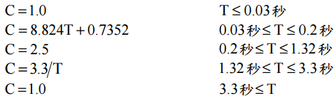}T ={1.0 ‒0.369},其地盤水平向正規化加速度 反應譜係數 C 值及週期 T 之關係,如下式: