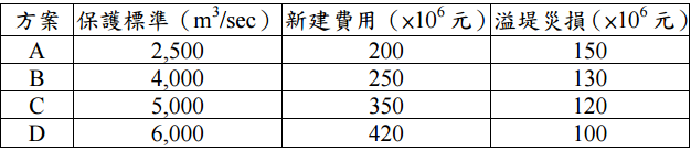 /sec,且流 量符合 Gumbel Type I 機率分布函數。今提出 4 組新建堤防方案,其保護標準、新建 費用、溢堤損失等資料整理如下表。假設堤防經濟壽命期 20 年,年操作維護費用為 新建費用之 8%及年利率 5%情況下,依年計成本及災損期望值總和最小為評選方案 標準,則何方案中選?(25 分)