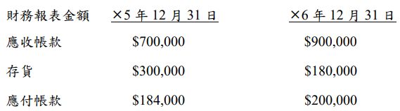 20. 寶山公司✖6 年度之銷貨淨額為 $9,600,000,且毛利率為 40%。寶山公司✖5 年與✖6 年資產負債表中之部分項目金額如下:(計算年度相關財務比率係以 360 天為基準)(A) 15 天 (B) 30 天 (C) 45 天 (D) 75 天