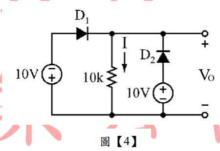 49. 如圖【4】所示,已知二極體為理想,電路中電流I約為多少?(A)0mA(B) 1mA(C) 2mA(D) 5mA