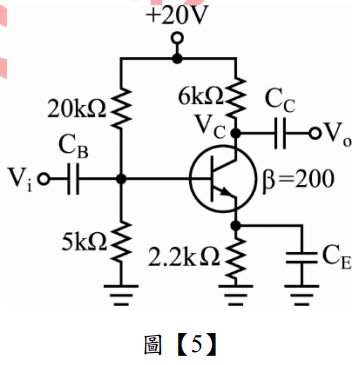 50. 如圖【5】所示,已知電晶體之ẞ = 200,VBE=0.7V,則集極電壓V⊂約為?(A) 8V(B) 9V(C) 11V(D) 13V