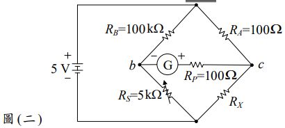 18.如圖(二)所示惠斯登電橋實習之電路,符號G代表檢流計,有關操作待測電阻RX量測時,下列敘述何者錯誤?