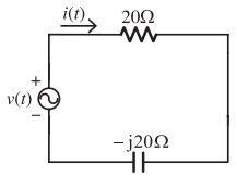 23. 有一電路如右圖所示,電源電壓v(t) =sin (377t)V,則下列敘述何者正確? [台糖110] (A) 總阻抗為∠45°Ω (B) 電源電流 i(t) = 5sin(377t + 45°)A (C) 電源電流相位領先電源電壓相位 45° (D) 電阻器兩端電壓為 100sin(377t – 45°)V