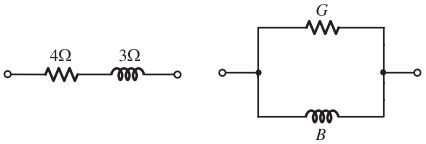 51. 若將下圖 ( 左 ) 之串聯電路轉成等效之並聯電路圖 ( 右 ),則 G 與 B 分別為 多少姆歐? [鐵路特考 111] (A)G = 0.16,B = 0.12 (B)G = 1.6,B = 1.2 (C)G = 0.16,B = – 0.12 (D)G = 1.6,B = – 1.2