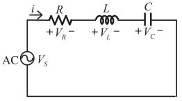 59. 如右圖所示,為 RLC 串聯電路,若測得 ∣ VC ∣ > | VL |,則下列何者正確? [台糖112] (A) 電流 i 相位領前電壓 VS (B) 電路呈現電感性 (C)VC 相位領前 VS 相位差 90° (D)VL 相位領前 VR 相位差 90°