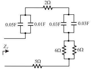 61. 如右圖所示之電路,若交流電源為 5sin1000t 伏特,求交流阻抗 ZT 約為多少 Ω ? [地方特考 112] (A)10 – j0.066 (B)10 – j0.033 (C)8 – j0.066 (D)8 – j0.033