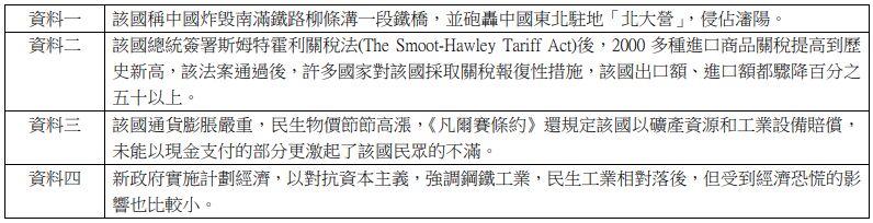 三:丙國在結束長期戰亂紛擾之後,出兵侵略甲國。對於丙國出兵的原因,有諸多解釋,有的學者認為當時丙國為了消滅武家勢力,以向外擴張來解決內部的壓力 ; 而有些學者則認為當時丙國的掌權者,有著稱霸天下的野心,出兵甲國、征服乙國是必要的。而丙國史昭也以「文祿慶長之役」正面宣示它的正當性!