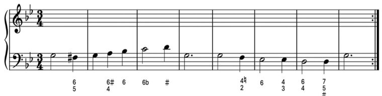 第五大題:四部和聲(每題 10 分,合計 10 分) 請以下列數字低音,完成混聲四部和聲,並標示調性及和弦級數。
