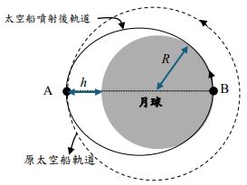 2.質量為M、半徑為R的月球,其地表上空h處有一艘質量為m的太空船,沿一圓形軌道繞月球公轉。為了能抵達月球表面,太空船之噴氣引擎在A點做了短時間的噴射,以便減慢太空船速度,如圖所示。若月球表面重力加速度量值為g,,太空船A點到達位於月球表面的B點,AB相當於噴射後太空船橢圓軌道的長軸。則太空船在軌道A點噴射後抵達月球表面B點瞬間的速率為何?(答案以R、h、g表示)