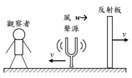 4.有一觀察者、聲源和反射板依照順序排列在一條直線上,如圖所示。若聲源和反射板可以沿著此直線個別移動,且無風時的聲波速率為v0。當觀察者維持靜止時,聲源發射固定頻率f的聲波,且以固定的速率v向左靠近觀察者,反射板則以相同速率v向右遠離聲源運動(v<v0),此時固定速率為w的風從觀察者吹向反射板,且w<v0。則觀察者接收「經反射板反射後的聲波」頻率為何?(答案以v、v0、w、f表示)