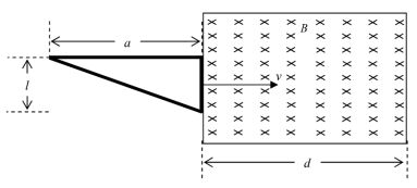5.如圖所示,一直角三角形線圈兩邊長分別為a及l、電阻為R,以等速度v通過一範圍為d(d>a),強度為B的均勻磁場,磁場的方向為垂直射入紙面,在時間t=0時,線圈的前緣恰接觸磁場的邊緣。則當0≤t≤a時,線圈上的感應電流大小i與時間t的關係式為何?