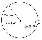 6.以光的「波動說」分析,在距功率為1.0W的燈泡1.0m遠的地方,垂直於光線放一塊鉀片(功函數為2.25eV)。假設一個電子能收集入射到半徑為m(鉀原子半徑)的圓形截面積上的光通量。則鉀片中一個電子要從光波中收集到足夠的能量以便逸出,需要多少秒的時間?(答案以四捨五入取至整數)