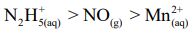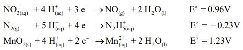 16. NO-3(aq) 、 N2(g)、 MnO2(s) 的標準還原電位分別為若各 物 質在 標 準狀 態下 進 行上 述 各反 應或 逆 反應 , 則 下 列敘 述哪一項正確? (A)氧化力的強弱順序為MnO2(s) > N2(g) > NO-3(aq) (B)氧化力的 強弱順序為 N2(g) > NO-3(aq) > MnO2(s) (C)還原力的強弱順序為 (D)還原力的強弱順序為