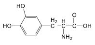 25.用於治療帕金森氏症的藥物 L-多巴胺的結構分析如下:預測 L-多巴胺的結構應為何者?a.分子式為 C9H11O4Nb.具有一個苯環結構 c.無法使 KMnO4(aq)酸性溶液褪色 d.結構中有 2 個羥基,且屬於α-胺基酸 e.加入氯化鐵水溶液會呈現藍紫色反應 (A) (B) (C) (D)