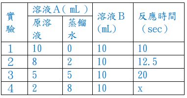 43.在秒錶實驗中,反應 IO3 - (aq)+3HSO3 - (aq) → I - (aq)+3SO42- (aq)+3H+ (aq) 的反應速率測定實 驗如下:(分子量 KIO3(s)=214 Na2S2O5(s)=190) 步驟 1:取 0.214 g KIO3(s)加水配成 100.0 mL 之溶液 A,另取 0.076 g Na2S2O5(s)、加入 0.5 mL 的 0.10 M H2SO4(aq) 及 0.400 g 澱粉加水配成 100.0 mL 之溶液 B。 步驟 2:在常溫下,取不同體積的溶液 A 加 水成 10.0 mL 並和 10.0 mL 溶液 B 同時倒入 燒杯,並迅速搖動溶液,使之瞬間混合均勻, 觀察溶液變成藍色,紀錄實驗結果如右。 關於此反應之相關敘述,哪些正確? (A)步驟 1 配製之溶液 A 中 [IO3 — ]的濃度為 0.01 M (B)步驟 1 配製之溶液 B 中 [HSO3 - ]的濃度為 0.008M (C)[HSO3 - ]在實驗 3 混合後的消失速率 2 X 10-4 M sec-1 (D)由實驗 1、2、3 得知反應速率對[IO3 - (aq)]為零級反應 (E)實驗 4 中 x 應為 50 秒