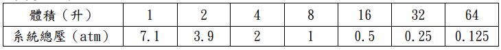 47.取 N2(g)及少量的水 W 克,置入一體積可變的容器中(不考慮氮氣在水中的溶解度),在 350 K下,改變容器體積測量平衡時總壓的變化如下表,則下列敍述哪些正確? (A)在一升的體積下,置入的 N2(g)分壓為 3.2 atm (B)W 約等於 1 克 (C)在 350K下,水的飽和蒸氣壓為 0.7 atm (D)體積為 3 升時,容器中尚有部分液態水存在 (E)置入的 N2(g)約 0.223 mol