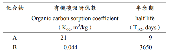 【已刪除】三、土壤若遭受下列兩種有機化合物(A 和 B)污染後,請依下表所提供化合物之特性, 比較這兩種化合物污染地下水之潛勢(potential)。(20 分)