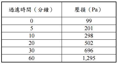 【已刪除】七、某一新濾布產品在實驗室中進行壓損測試,若已知進流廢氣之粉塵濃度為 10 g/m