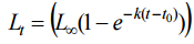 為魚之極限體長;k 為成長參數和 t