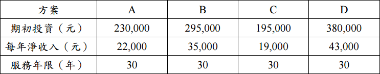【已刪除】一、政府欲興建一水工結構物,共有四項方案可以採用,四項方案的資料如下表所示, 試應用本益分析(Cost-Benefit Analysis)選擇最有利的方案(年利率為 10%)。 (20 分)