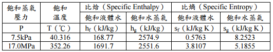 【已刪除】二、考慮一蒸汽動力廠,以水為工作介質,且依循朗肯循環(simple Rankine cycle)來 運轉。利用幫浦輸入功 17 kJ/kg,使得水的壓力從 7.5 kPa 提升至 17.0 MPa;假設水 經過蒸氣產生器後,形成飽和水蒸氣(乾度(quality)100%)。請繪出朗肯循環 的 T-s 圖,並計算蒸汽動力廠的熱效率。(請利用下表所列水的熱力性質表估算) (20 分)