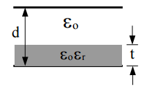,現於兩平行板 間放入一厚度 t 之介質平板,其相對介電係數為 εr,如圖三所示,推導此時平行板 電容器之貫穿電壓,並說明較原 V