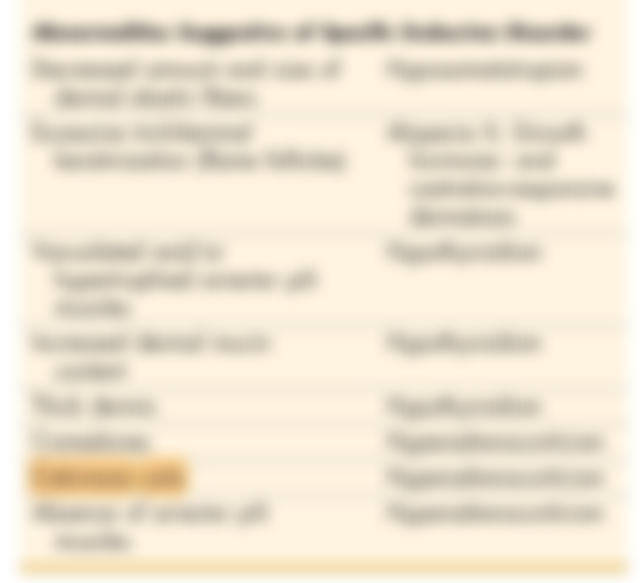 60.下列關於犬皮膚病變的敘述,何者錯誤? (A)腎上腺皮質機能亢進症(hyperadrenocorticism)常見毛囊處於休止期 (B)甲狀腺功能低下(hypothyroidism)可見鈣鹽沉著 (C)動情素過多症(hyperestrogenism)常見對稱性脫毛,毛囊內富含角質 (D)落葉型天疱瘡(pemphigus foliaceus)常見血管病變