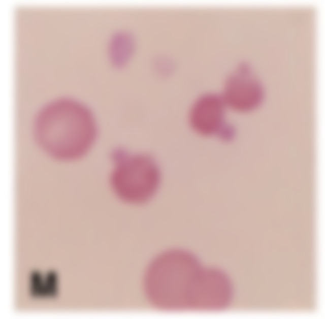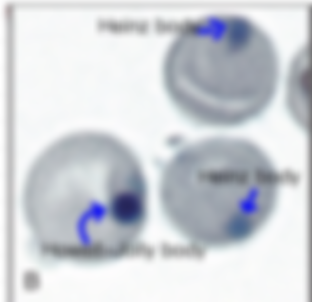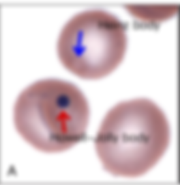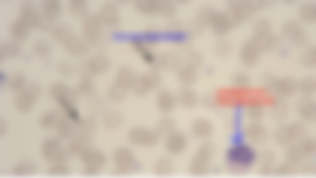 14.箭頭所指最可能為何? (A)嗜鹼性斑點(basophilic stippling)(B)海因滋小體(Heinz bodies) (C)賀-邱氏小體(Howell-Jolly bodies) (D)有核紅血球的核