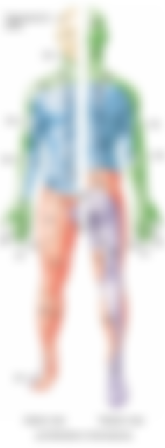 18.關於皮節(dermatome)的敘述,下列何者正確?(A)適用於體表感覺與肌肉運動分區概念 (B)每一對脊神經(spinal nerve)負責一個特定區域,且兩兩相鄰的皮節範圍有部分重疊 (C)每一個皮節範圍都一樣,以確保訊息傳遞不會出錯 (D)只有身體前面有皮節分布,後側則沒有此分布