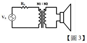 3.如【圖 3】所示電路,Rs=400Ω 且使用 16Ω 喇叭,若要達到「阻抗匹配」的效果,則變壓器初級 與次級線圈之圈數比(N1:N2)為何?