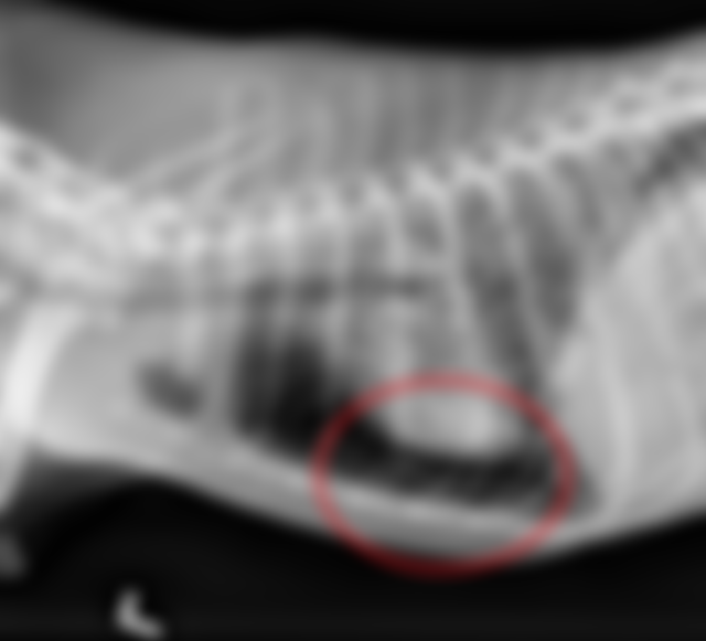 48.13歲哈士奇(Husky)犬呈現消瘦、虛弱、喘、食慾廢絕、尿失禁,胸腔影像如下圖,下列敘迹何者正確? (A)後肺葉血管直徑變大 (B)有氣胸(pneumothorax) (C)有胸膜腔積液 pleuraleffusion) (D)心臟變小,可能和嚴重脫水有關