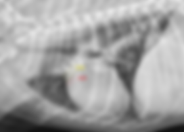 74.6歲未去勢混種公犬,出現喘、咳嗽及運動不耐症狀,胸腔左側照及背腹照光影像如下圖,左側照圖中箭號 所指的部位為何? (A)變大的右前肺葉肺動脈 (B)變大的右前肺葉肺靜脈 (C)正常的右前肺葉肺動脈 (D)變大的左前肺葉肺靜脈