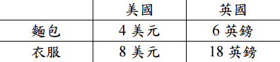 四、假設英、美兩國都只生產麵包與衣服兩種商品,兩種商品國內價格如下表所示。